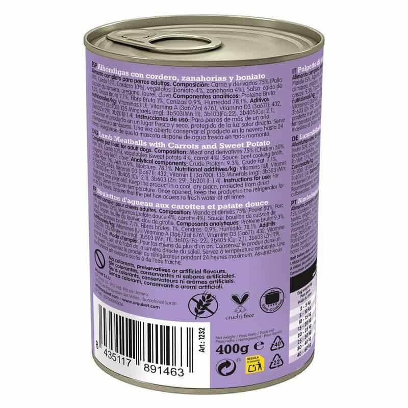 A la hora de alimentar a tu mascota, las latas de ALBONDIGAS con Cordero & Zanahoria & Boniato son una opción rica y saludable.