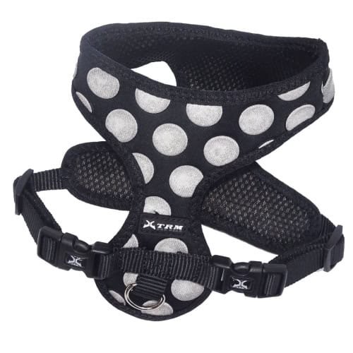 Arnés infantil con diseño de lunares en negro y blanco, ajustable y cómodo para mascotas pequeñas.Arnes 3D Dots L 40 X55-65Cm. Azul