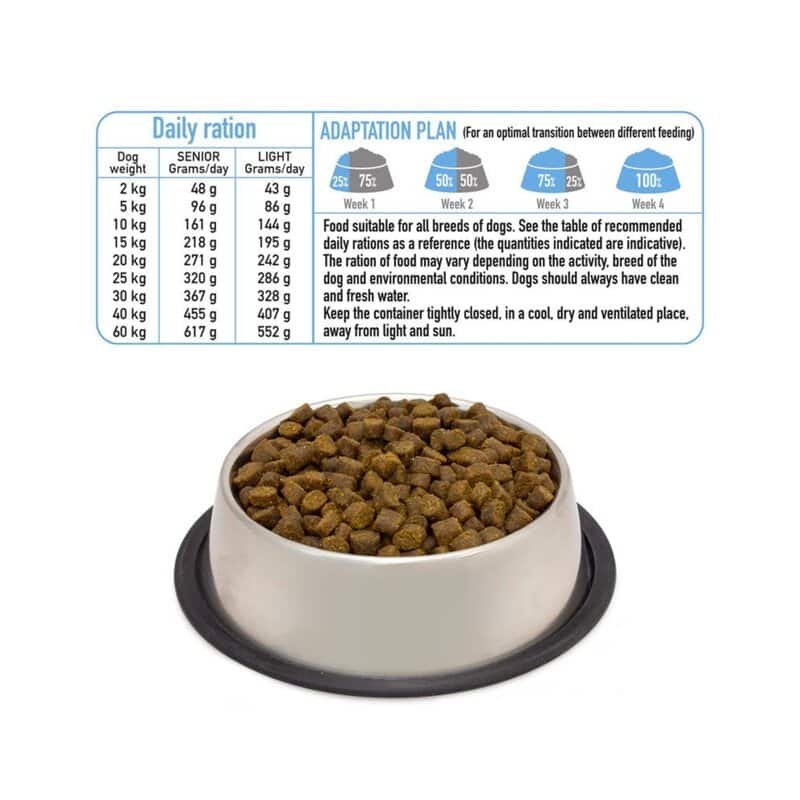 Alimento completo semihúmedo para todo tipo de razas perros mayores o con sobrepeso, con un 50% de pavo fresco, un 26% de pescado blanco fresco y un 24% de vegetales, frutas y hierbas medicinales. Prensado en frío, no extruido, procesamiento mínimo. Sin gluten, sin harinas cárnicas, sin colorantes ni aromatizantes artificiales. Cocinado lentamente y a baja temperatura.ALIMENTO COMPLETO PARA PERROS A partir de 7 años o propensos a tener sobrepeso.COMPOSICIÓN: 50% pavo fresco, 26% pescado blanco fresco, almidón parcialmente hidrolizado, pulpa remolacha molida, calabaza, levadura cerveza, achicoria,arandanos, pera, manzana, curcuma, romero, tomillo.COMPONENTES ANALÍTICOS: Proteína 26%, fibra bruta 2,5%, grasa bruta 10%, materia inorgánica 7%, humedad 20%. Energía metabolizable/Kg: 3.320 Kcal / 12.419 KJ.ADITIVOS NUTRICIONALES (por kg MS): Vitamins (IU): Vitamin A (3a672a) 22726, Vitamin D3 (3a671): 1450, Vitamin E (3a700):454. Minerales (mg): 3b503(Mn:36), 3b103(Fe:72), 3b405(Cu: 7.2), 3b603(Zn:100), 3b201(I:1.27).MODO DE EMPLEO: Alimento apto para todas las razas de perros adultos a partir de 7 años o propensos a tener sobrepeso. Tome como referencia la tabla de cantidades diarias recomendadas (las cantidades indicadas son orientativas). La cantidad de alimento puede variar en función de la actividad, raza del perro y condiciones medioambientales. Los perros deben disponer siempre de agua limpia y fresca. Mantener el envase bien cerrado, en un lugar fresco, seco y ventilado, lejos de la luz y el sol. Este producto tiene una vida útil de 15 meses