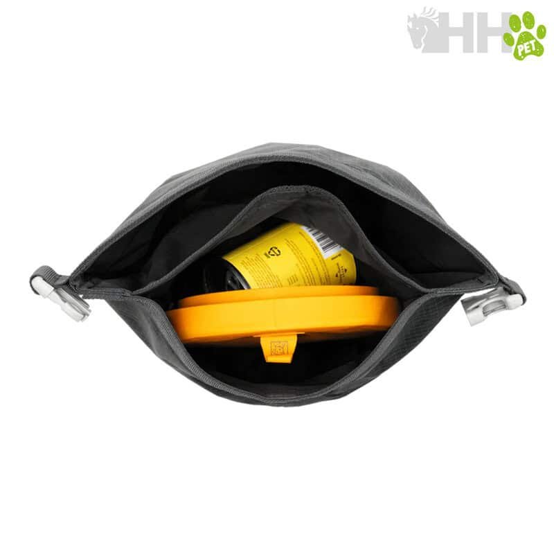 Incluye un compartimento interno independiente para guardar tazones plegables, premios u otros accesorios de alimentación. Fabricado con material impermeable de calidad alimentaria, resistente al aceite y con sellado de olores.