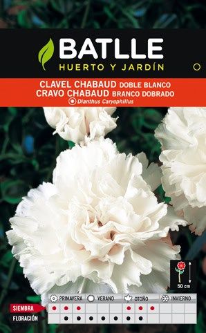 Calas de clavel chabaud doble blanco para jardinería y huerto, planta ornamental y floración, ideal para primavera y verano. Clavel Chabaud Blanco Sobre