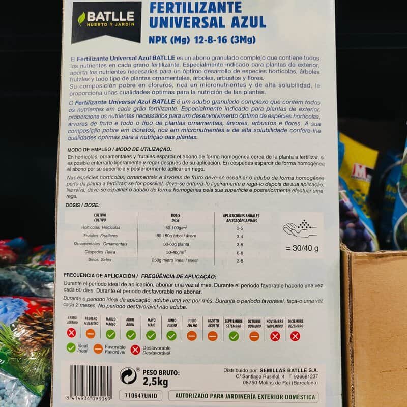 Proporciona a tus plantas la nutrición balanceada que necesitan con el FERT.UNIVERSAL AZUL 2,5 KG, un abono ideal para un crecimiento vigoroso y saludable.