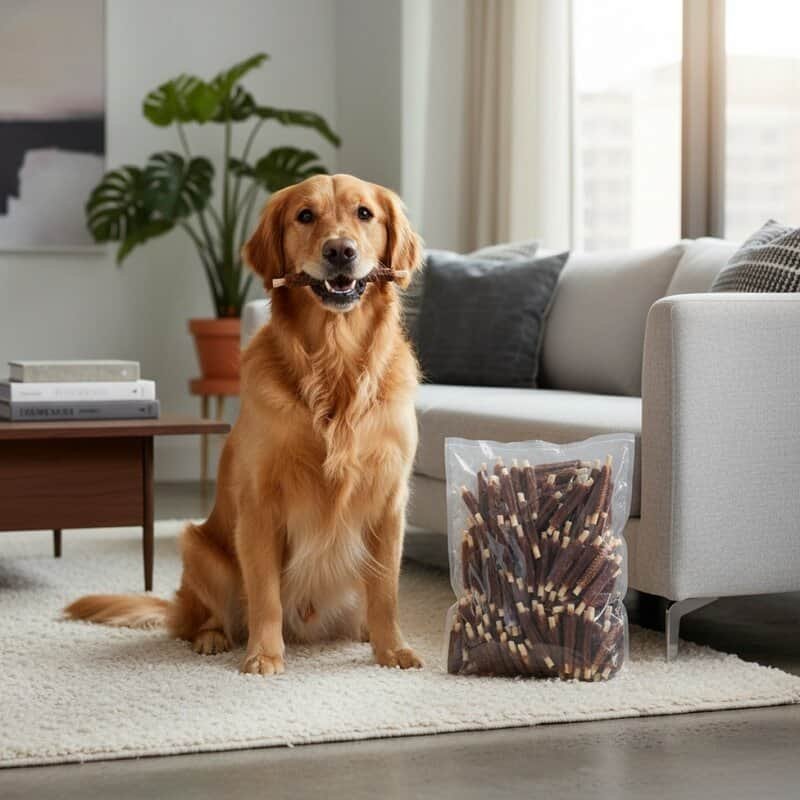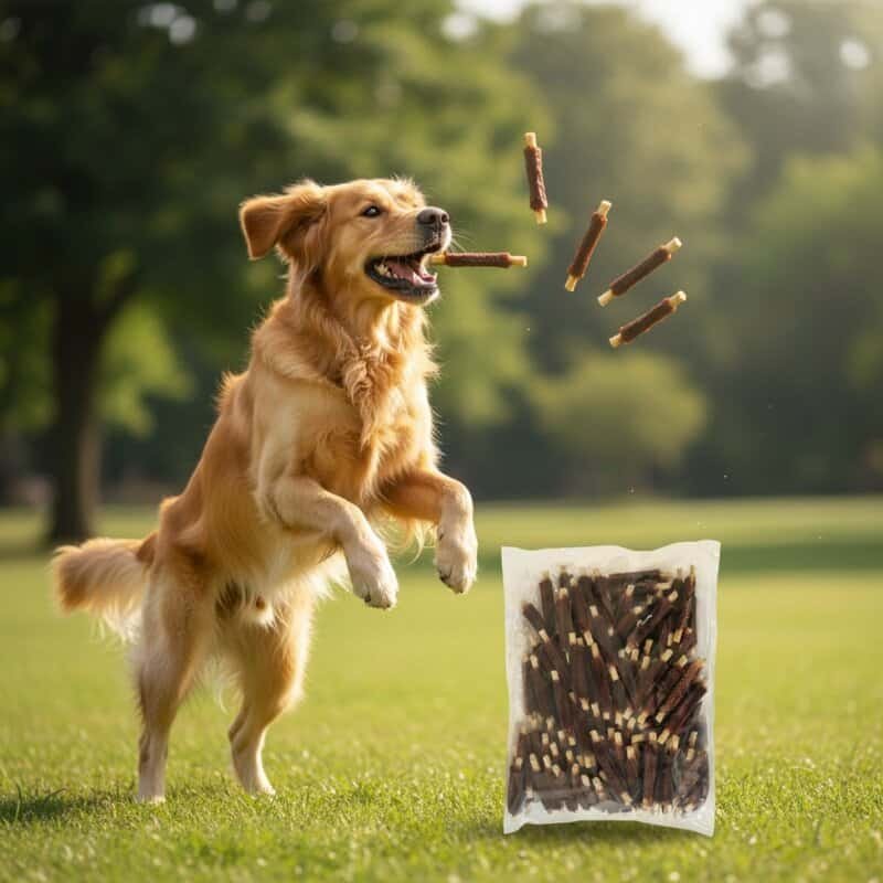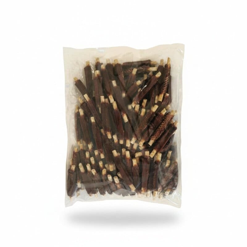 Snack para perros elaborado con un 41,3% de pollo natural deshidratado y un 8% de proteína de soja. Este producto está diseñado para ofrecer un aporte nutritivo y equilibrado, adecuado para perros de todas las razas y edades. Su textura tierna y forma de costilla favorecen una masticación segura y divertida, contribuyendo a la salud bucal al ayudar a limpiar los dientes. Además, la proteína de soja mejora la digestión y puede ayudar en la regulación del colesterol y el control del peso. La dosificación recomendada varía según el peso del perro: 1-10 g para perros de 3-5 kg, 10-20 g para 5-10 kg, 20-40 g para 10-25 kg y 40-60 g para perros de más de 25 kg. Este snack no contiene colorantes ni conservantes artificiales y se presenta en un formato de 1 kg en granel, ideal para criadores, adiestradores y tiendas de mascotas que buscan una opción económica y nutritiva.