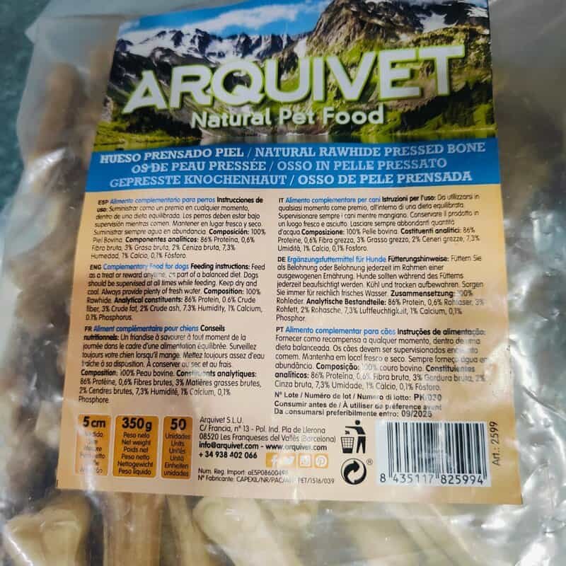 ArquiVet hueso prensado natural para mascotas, hueso de piel prensada cruda en paquete de 600 g.Hueso Prensado Piel 5Cm. Bolsa 50 Uds.