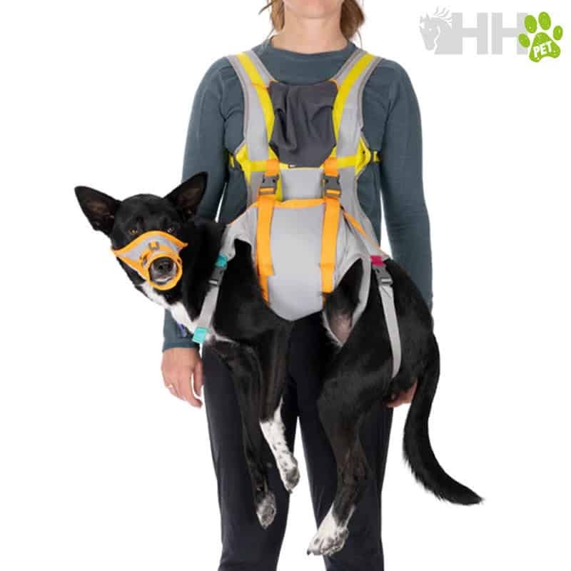 Chaleco para humanos con cabestrillo incorporado para perros: con múltiples puntos de ajuste para ambos, correas codificadas por colores que facilitan su colocación y la posibilidad de transportar al perro tanto en la parte delantera como en la trasera del cuerpo.