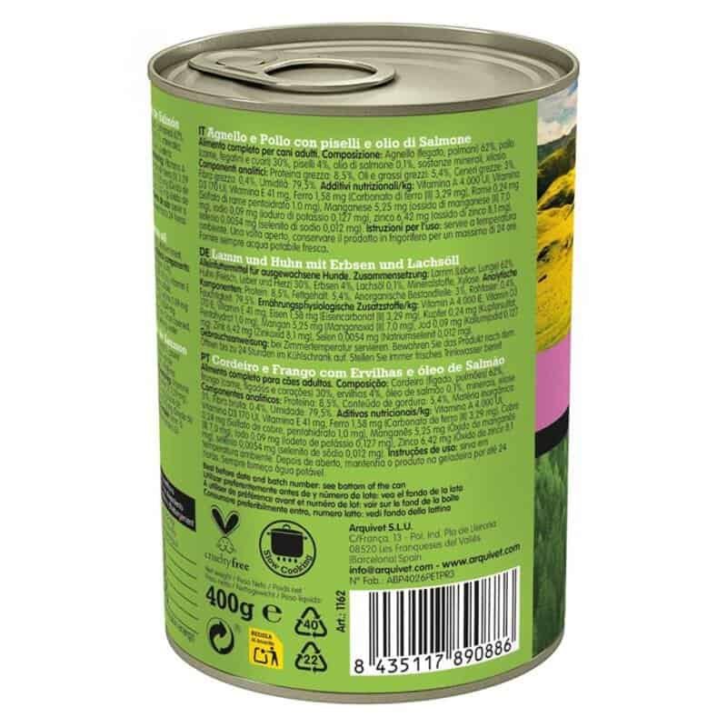 Alimento para mascotas natural en lata de carne de cordero y pollo con guisantes para perros adultos.Lata Cordero Y Pollo Con Guisantes 400Gr