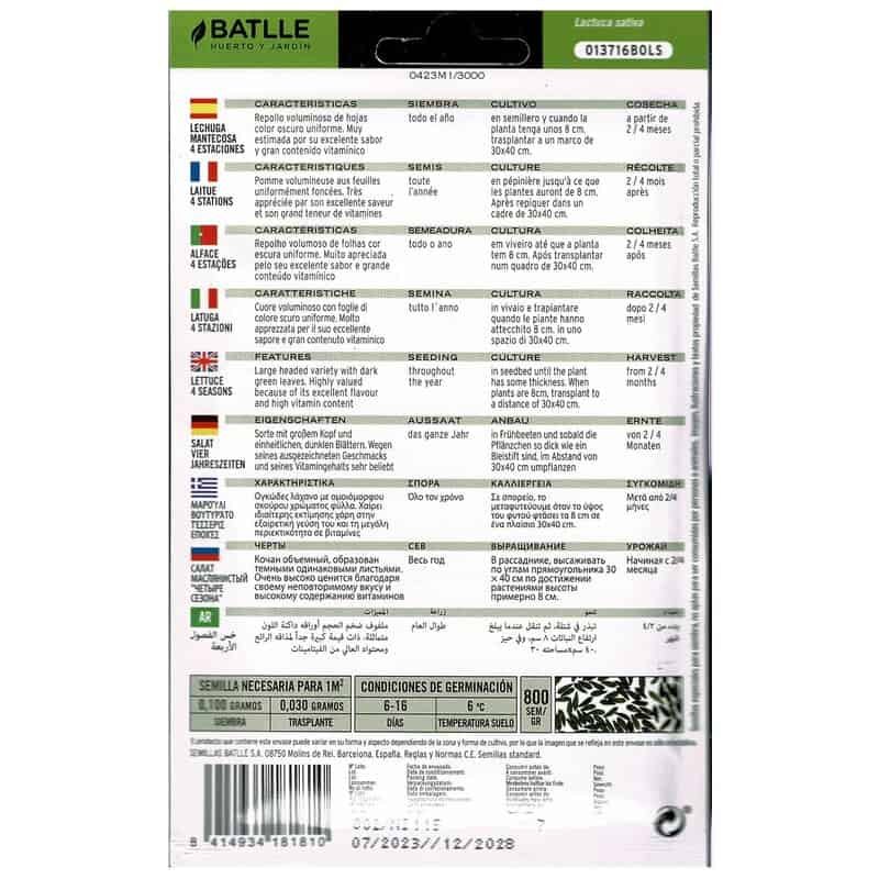 Imagine disfrutar de su propia lechuga fresca y saludable durante todo el año. Con Lechuga 4 Estaciones, esto es posible. Este sobre contiene semillas listas para cultivar su lechuga en cualquier estación, brindándole un suministro constante de vegetales frescos y sabrosos directamente desde su huerto.