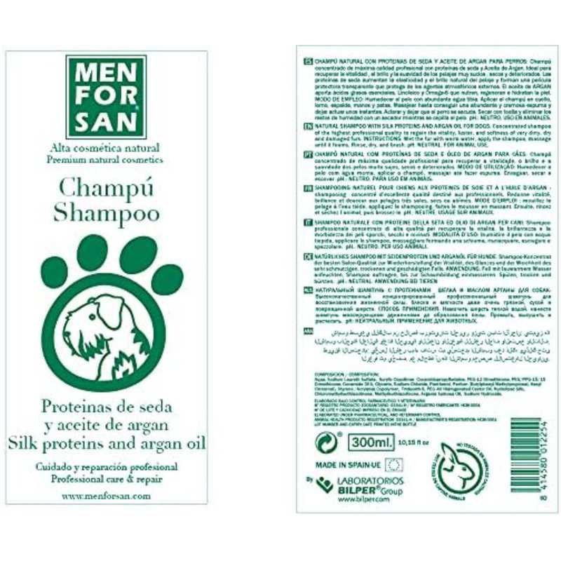 Champú para perros con argán y proteínas, cuidado y reparación capilar para mascotas.Menforsan Champu Aceite De Argan Y Proteinas 300Ml.