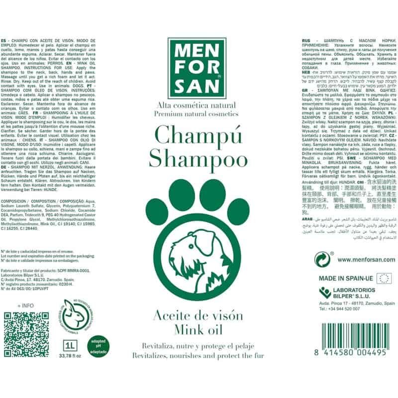 Aporta a tu mascota un aspecto saludable y brillante con MENFORSAN CHAMPU ACEITE DE VISON 1 LT, repleto de nutrientes esenciales.