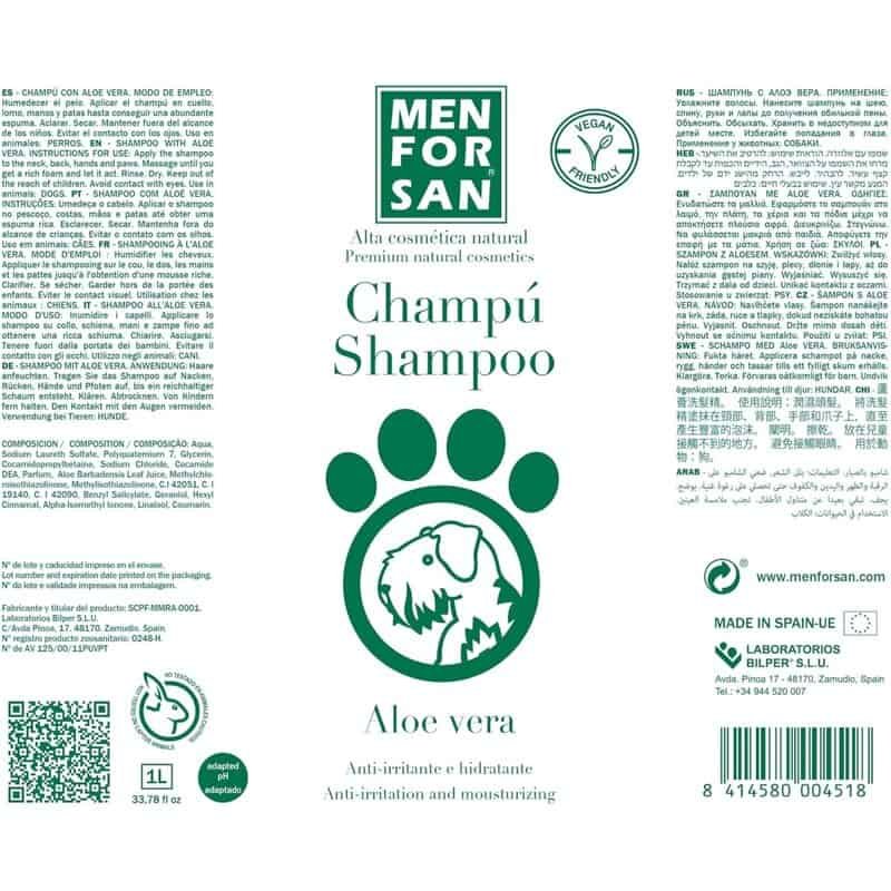 Bote de champú para perros con aloe vera y marca Men For San.Menforsan Champu Con Aloe Vera 1 Lt.