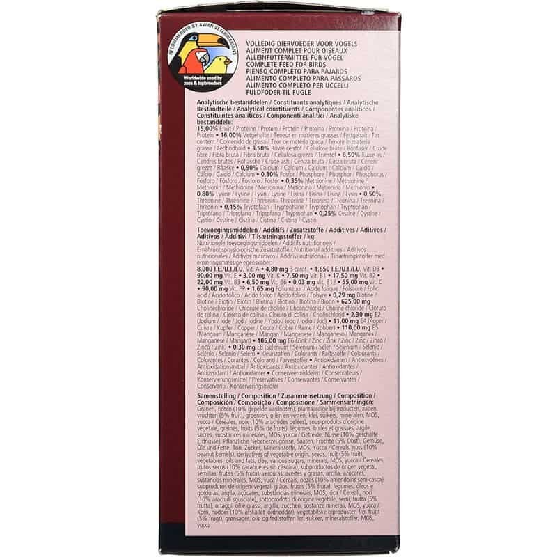 Todos los componentes de este alimento son 100% consumibles, lo que significa que no hay desperdicio de alimentos. Está científicamente formulado para proporcionar el equilibrio perfecto de nutrientes esenciales que tu pájaro necesita para mantenerse fuerte y saludable.