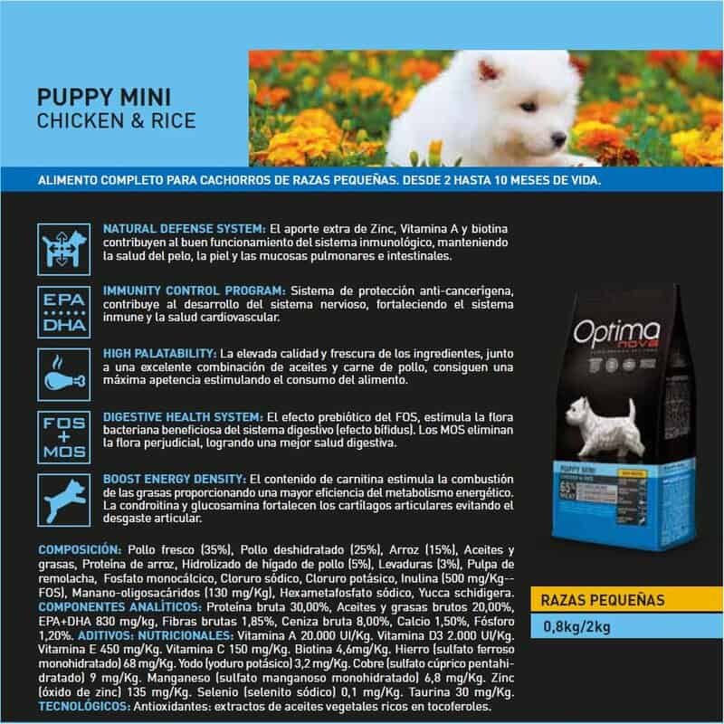 Optima Nova Puppy Mini Pollo Arroz favorece el crecimiento y desarrollo óptimo de perros de tamaño mini.