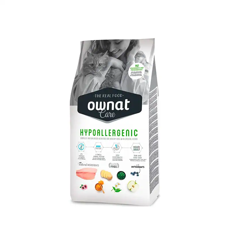 Ownat Care Cat Grain Free Hypoallergenic es un pienso premium sin cereales de Ownat para gatos, formulado con pescado como única fuente de proteína animal para minimizar alergias e intolerancias digestivas o cutáneas
