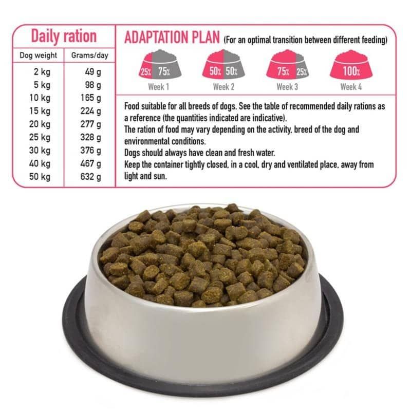 Alimento semihúmedo de Pavo fresco criado en libertad – FreshAlimento completo semihúmedo para todo tipo de perros adultos, con un 55% de pavo fresco, un 20% de pescado fresco y un 25% de vegetales, frutas y hierbas medicinales. Prensado en frío, no extruido, procesamiento mínimo. Con ingredientes 100% naturales, sin gluten, sin harinas cárnicas, sin colorantes ni aromatizantes artificiales. Cocinado lentamente y a baja temperatura.COMPOSICIÓN: 55% pavo fresco, 20% pescado fresco (lubina, dorada, atún, pez espada, sardina, boquerón y jurel), almidón parcialmente hidrolizado, pulpa de remolacha molida, espinaca, levadura de cerveza, achicoria, piña, pera, manzana, cúrcuma, romero, tomillo.COMPONENTES ANALÍTICOS: Proteína 27%, fibra bruta 1,5%, grasa bruta 17%, materia inorgánica 6%, humedad 20%. Energía metabolizable/Kg: 3.750 Kcal / 14.176 Kj.ADITIVOS NUTRICIONALES (por kg MS): Vitaminas (IU): Vitamin A (3a672a) 22726, Vitamin D3 (3a671): 1450, Vitamin E (3a700): 454. Minerales (mg): 3b503(Mn:36), 3b103(Fe:72), 3b405(Cu:7.2), 3b603(Zn:100), 3b201(I:1.27).MODO DE EMPLEO: Alimento apto para todas las razas de perros. Tome como referencia la tabla de cantidades diarias recomendadas (las cantidades indicadas son orientativas). La cantidad de alimento puede variar en función de la actividad, raza del perro y condiciones medioambientales. Los perros deben disponer siempre de agua limpia y fresca. Mantener el envase bien cerrado, en un lugar fresco, seco y ventilado, lejos de la luz y el sol. Este producto tiene una vida útil de 15 meses.