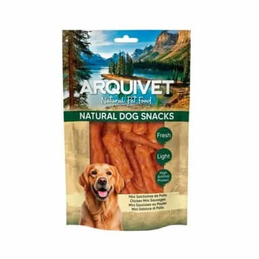 Mini salchichas de polloSnacks naturalesMini salchichas de pollo, snack 100% natural, perfecto como premio para nuestro perro a la vez que ayuda a cuidar de sus dientes y encías. Con un alto contenido en proteína animal y con pocas grasas (Producto Light). AAlimento complementario para perros, muy rico en nutrientes.Composición: Pollo 81%, Glicerina 4,7%, Proteínas vegetales (Haba de Soja) 4%, Sorbitol 3%, Almidón de maíz 3%, Harina de trigo 2%, Colágeno 2%, Sal 0,2%. Aditivos: Sorbato de potasio 0,1% (1k202).Componentes analíticos: Proteína cruda 25%, Grasa cruda 4%, Fibra cruda 1%, Materia inorgánica 5%, Humedad 18%.Instrucciones de alimentación: Suministrar como un premio en cualquier momento, dentro de una dieta equilibrada. Los perros deben estar bajo supervisión mientras comen. Mantener en lugar fresco y seco. Suministrar siempre agua en abundancia.NO APTO PARA CONSUMO HUMANO.
