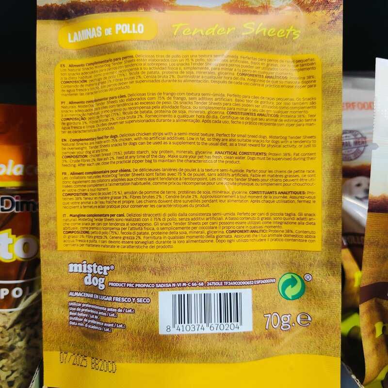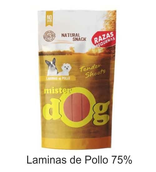 Snack LAMINAS De POLLO 70 gr. Mister Dog, cuidadosamente preparado para ser irresistible y saludable!