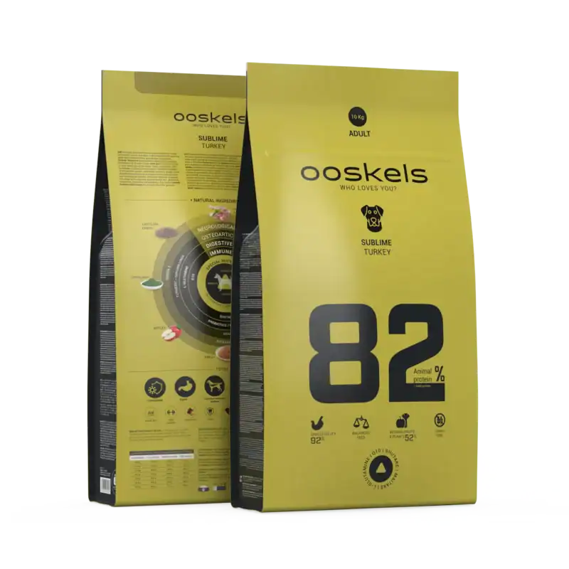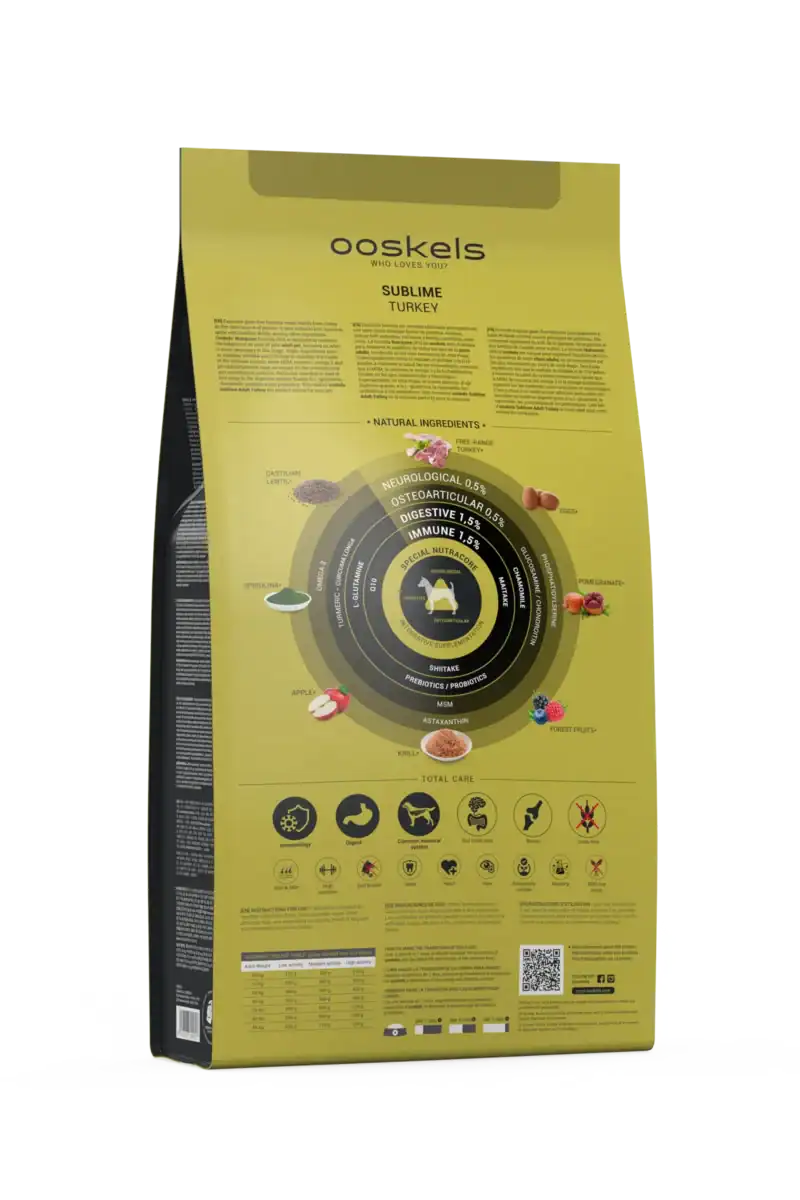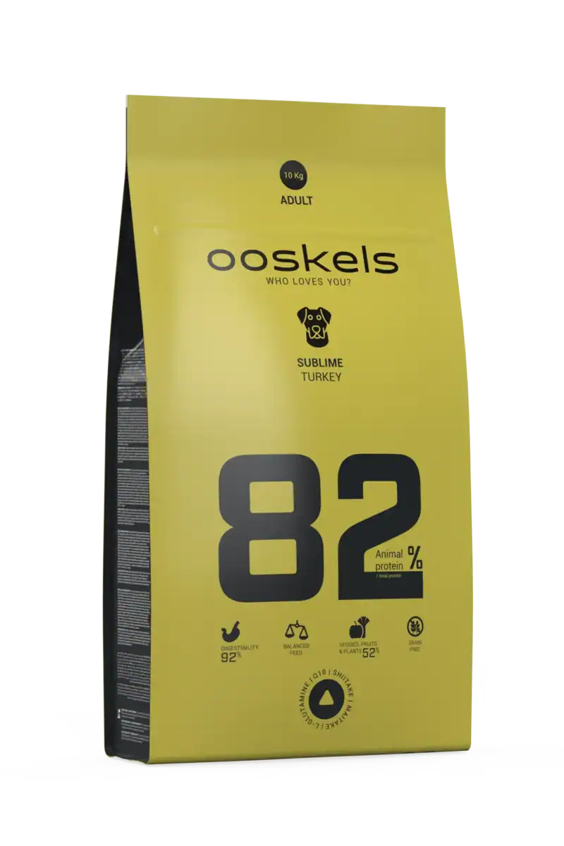 Ooskels Sublime Adult Turkey es un pienso sin cereales para perros adultos, con pavo fresco (30%) y deshidratado (25%) como fuentes principales de proteína (82% animal/total). La fórmula Nutracore (4%) equilibra ejes como inmunológico, digestivo, osteoarticular y neurológico, con krill, espirulina, manzana y lenteja castellana.