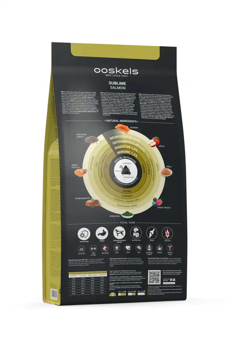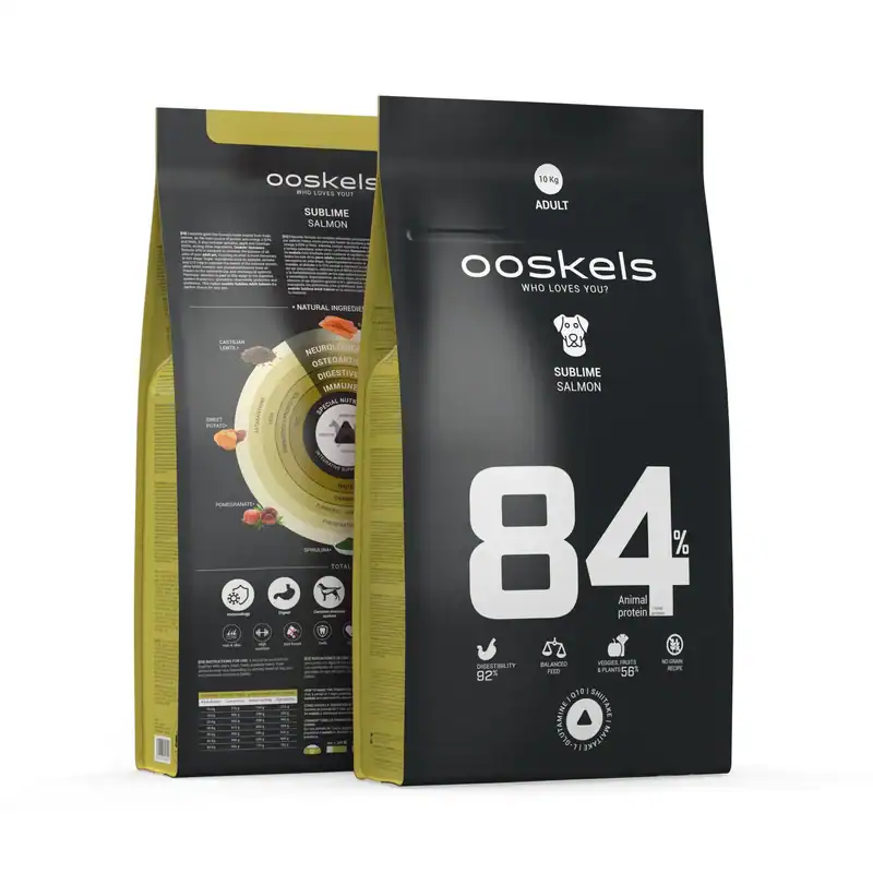 Ooskels Sublime Adult Salmon es un pienso sin cereales para perros adultos, elaborado principalmente con salmón fresco (mín. 30%) como fuente principal de proteína (84% animal/total) y omega-3 (EPA/DHA). La fórmula Nutracore (4%) equilibra ejes clave como inmunológico, digestivo, osteoarticular y neurológico, con espirulina, manzana y lenteja castellana.