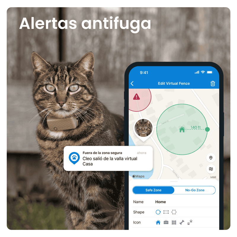 Vallas virtuales: Crea zonas seguras o prohibidas y recibe alertas inmediatas si tu gato las cruza.