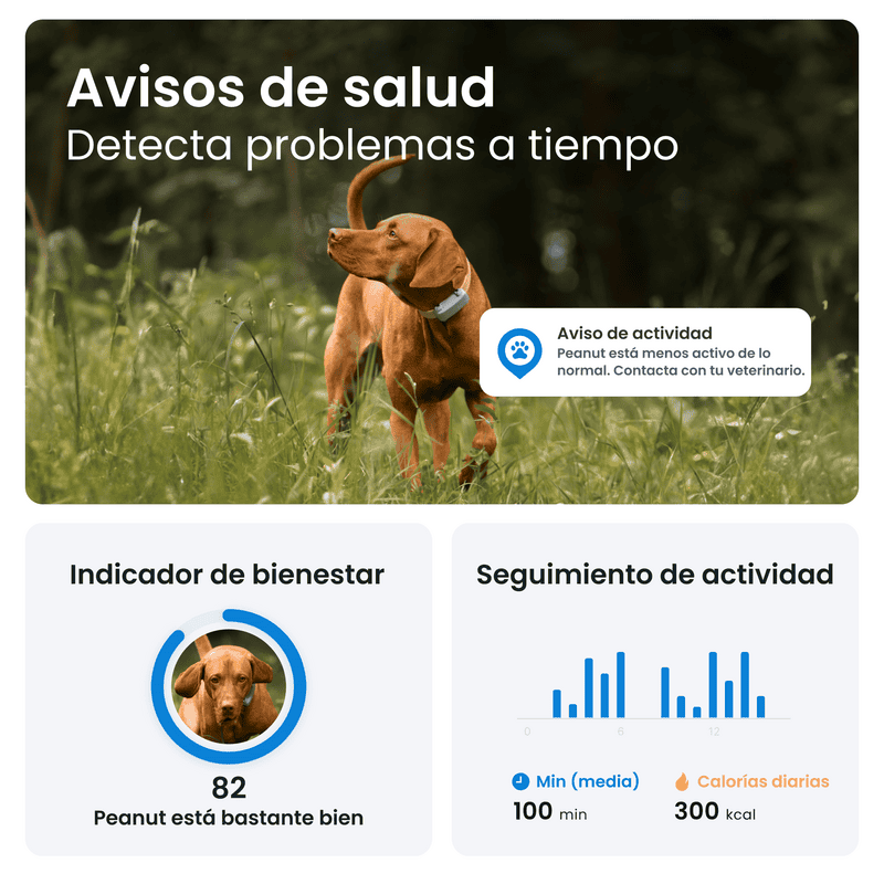 Descubre cómo está en un instante. Establece objetivos y compáralo con otros perros similares. Conoce sus patrones del sueño y detecta posibles problemas a tiempo.