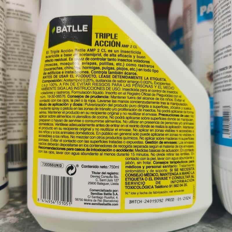 TRIPLE ACCION (Insectos) 750 ml. Batlle, es fácil y seguro de usar, y está diseñado para trabajar rápidamente sin dejar residuos que puedan ser perjudiciales para sus mascotas. Proteja a sus animales y a su hogar de las molestas plagas con este producto efectivo y seguro.