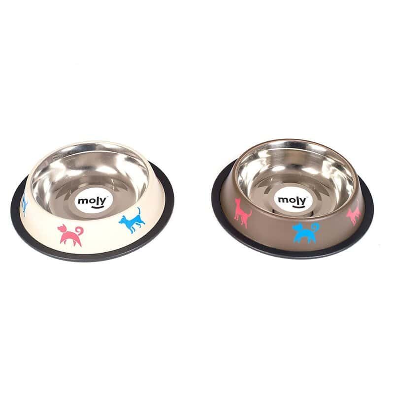 Comedero de acero inoxidable de 0,55 litros con base antideslizante, disponible en beige y chocolate.