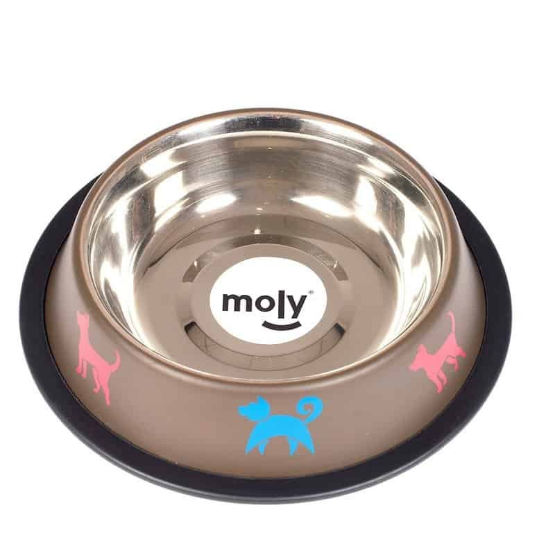Comedero fabricado en acero inoxidable de alta calidad, con capacidad de 0,55 litros y un diámetro de 16 cm, diseñado para perros pequeños y medianos, así como para gatos. Incorpora un anillo de goma en la base que proporciona un efecto antideslizante, evitando movimientos durante el uso. Su diseño es compatible con lavavajillas, facilitando la limpieza y manteniendo la higiene. Adecuado para el uso diario con pienso seco, comida húmeda o agua. Disponible en dos colores: beige y chocolate.